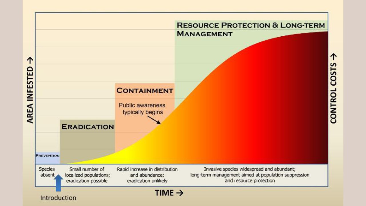 The chart also highlights the four types of control options that are generally available as an invasive becomes more widespread in an area. Over time, complete eradication from an infested area becomes more difficult and expensive.
