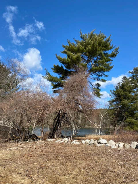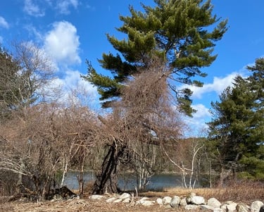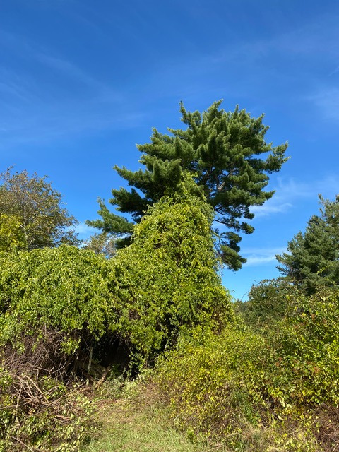 Bittersweet and multiflora rose strangling and smothering a mature white pine in Damariscotta.