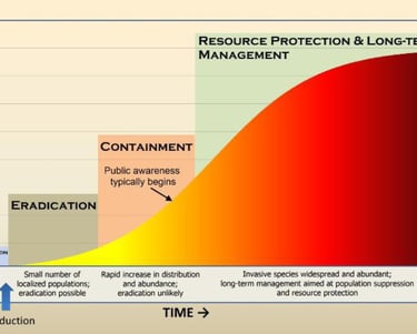 The invasion curve. Adapted from Invasive Plants and Animals Policy Framework, State of Victoria, Department of Primary Industries, 2010. See: https://edis.ifas.ufl.edu/publication/UW392 (University of Fla.)
